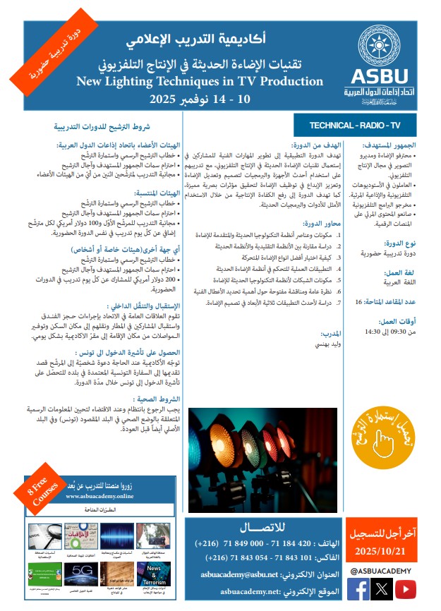 تهدف الدورة التطبيقية إلى تطوير المهارات الفنية للمشاركين في إستعمال تقنيات الإضاءة الحديثة في الإنتاج التلفزيوني، مع تدريبهم على استخدام أحدث الأجهزة والبرمجيات لتصميم وتعديل الإضاءة وتعزيز الإبداع في توظيف الإضاءة لتحقيق مؤثرات بصرية مميزة، كما تهدف الدورة إلى رفع الكفاءة الإنتاجية من خلال الاستخدام الأمثل للأدوات والبرمجيات الحديثة.