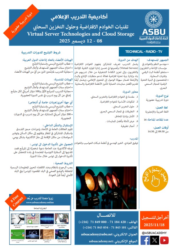 يشمل التدريب تعريف المشاركين بمفهوم الخوادم الافتراضية (Virtual Servers) وأهميتها في تحسين إدارة الموارد التقنية للإذاعة والتلفزيون، وإلى تعزيز الكفاءة التشغيلية من خلال تدريبهم على بناء وإدارة بنية تحتية افتراضية فعالة تدعم متطلبات الإنتاج والبث والأرشفة لضمان سهولة الوصول إلى المحتوى الإعلامي، ويشمل أيضًا تقديم لأفضل ممارسات الحماية لتأمين الأنظمة الافتراضية والسحابية.