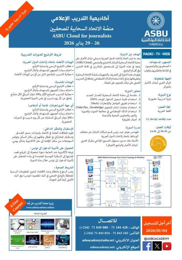 بعد ما درّب اتحاد إذاعات الدول العربية منسقي تبادل الأخبار على منصّة الاتحاد السحابية للتبادل الاخباري والبرامجي (ASBU Cloud) يتجه في هذه الدورة إلى المستعملين المباشرين في قاعة التحرير